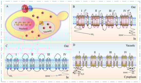 Based on their activation mechanisms, Ca2+ channels in S. cerevisiae are classified into three types: (i) Cch1 of the voltage-gated calcium channel (VGCC); (ii) Mid1 of the stretch-activated calcium channel (SACC); and (iii) Yvc1 of the transient receptor potential (TRP) channel [,,] (Figure 1A). Cch1 and Mid1 are located in the cell membrane, whereas Yvc1 is located in the vacuole membrane. Ca2+-permeable channels regulate the passive flow of Ca2+ across the plasma membrane into the cytoplasm.
