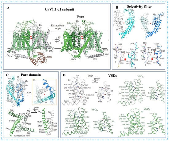 Structure of the α1 subunit in Cav1.1 [,]. (A) Overall structure of α1 subunit; CTD, C- terminal domain; red spheres indicate the tentatively assigned calcium ions (Ca2+) in the selectivity filter vestibule. (B) Structural elements of the selectivity filter. (C) Four-fold pseudo-symmetry of the pore domain; loops between S5 and P1 helices and between P2 and S6 helices are shown as L5 and L6 loops, respectively. (D) Structures of the four voltage-sensing domains (VSDs). Gating charges on helix S4 and the occluding phenylalanine residue on S2 are shown as sticks.