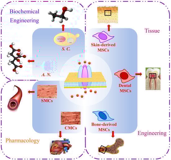 Applications of calcium ion (Ca2+) channels in Saccharomyces cerevisiae. SMCs, smooth muscle cells; CMCs, cardiac muscle cells; S. C., Saccharomyces cerevisiae; A. N., Aspergillus niger; MSCs, mesenchymal stem cells.