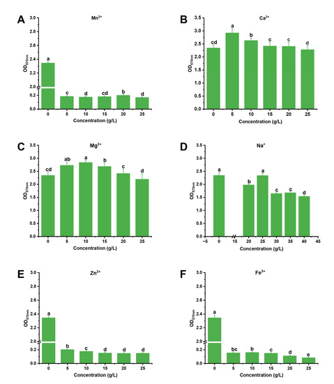 Effect of different concentrations of metal ions on B. mojavensis D50 biofilm formation: Mn2+ (A), Ca2+ (B), Mg2+ (C), Na+ (D), Zn2+ (E), and Fe3+ (F). The strain D50 (5 μL) was inoculated into mediums (containing different metal ions) and cultured at 30 °C for 48 h. Bars followed by the same letter are significantly different at p < 0.05 using a least significant difference (LSD) test. Error bars indicate the SD of three experiments. SD, standard deviation.