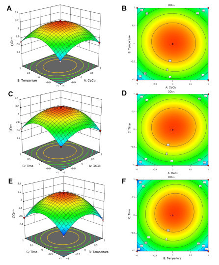 Three-dimensional response and two-dimensional surface contour for biofilm formation amount as evaluation indicators. The interactions between solution concentration of CaCl2 and temperature (A,B); solution concentration of CaCl2 and time (C,D); and temperature and time (E,F). The change of color from blue to red in the graph indicates a change in extraction quality from less to more, and the faster the change, the greater the slope, which has a more significant impact on the experimental results.