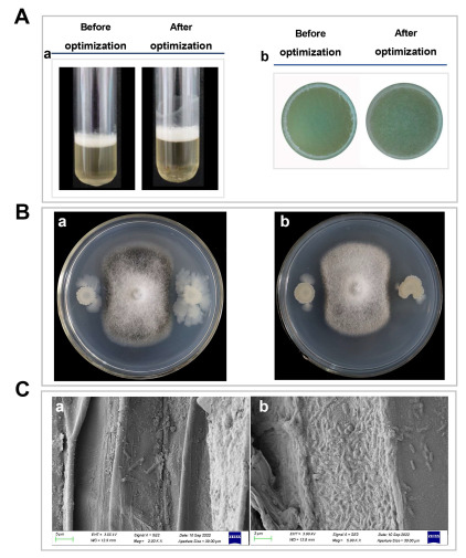 Antagonistic abilities and colonization capacity are important targets to optimize for high biocontrol ability. Therefore, these abilities were measured. As shown in Figure 5A, the biofilm of B. mojavensis D50 (after optimization) was more viscous and denser than those in B. mojavensis D50 (before optimization). The biofilm yields of B. mojavensis D50 (after optimization) were more than those in B. mojavensis D50 (before optimization). The antagonistic abilities were improved after optimization, and the morphology of B. cinerea obviously changed (Figure 5B). After optimization, the colonization capacity of B. mojavensis D50 increased in the root of the tomato plant (Figure 5C). These results could indicate that the biocontrol ability of B. mojavensis D50 increased after optimization.