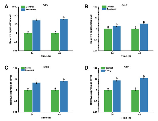 The levels of expression of the genes luxS, SinR, FlhA, and tasA related to biofilm formation were detected using qRT-PCR: (A) luxS, (B) SinR, (C) tasA, (D) FlhA. B. mojavensis D50 (1.0 × 108 cfu/mL, 1 mL) was inoculated into initial medium (100 mL) and cultured at 30 °C for 48 h as the control, while B. mojavensis D50 (1.0 × 108 cfu/mL, 1 mL) was inoculated into optimization medium (100 mL) and cultured at 31.4 °C for 51.8 h as the treatment. Bars followed by the same letter are significantly different at p < 0.05 using a least significant difference (LSD) test. Error bars indicate SD of three experiments. qRT-PCR, quantitative PCR; SD, standard deviation.
