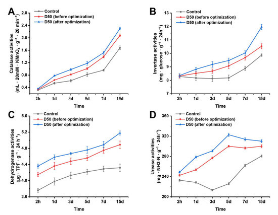 Soil enzyme activities in various treatments (sterile water as control; B. mojavensis D50 before or after optimization as treatment): (A) catalase, (B) invertase, (C) dehydrogenase, and (D) urease. The soil was collected at 2 h, 1 day, 3 days, 5 days, 7 days, and 15 days after the inoculation with strain D50 (before and after optimization). Error bars indicate SD of three experiments. SD, standard deviation.