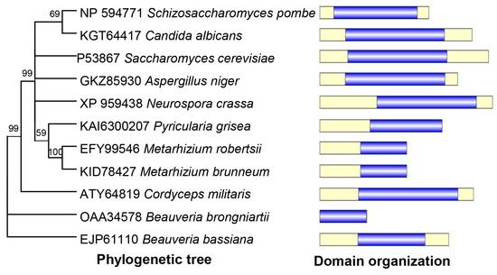 Basic Local Alignment Search Tool (BLAST) (http://blast.ncbi.nlm.nih.gov/blast.cgi (accessed on 1 March 2023)) was used to identify BbAtg4 protein through the NCBI databases using S. cerevisiae Atg4 (P53867) as a query. The Atg4 orthologs were downloaded from NCBI databases, and their domain architectures were analyzed through the online portal SMART (http://smart.embl-heidelberg.de (accessed on 1 March 2023)). The Atg4 homologs in yeasts and filamentous fungi were clustered using the maximum likelihood method through the online program MEGA7 (http://www.megasoftware.net/ (accessed on 1 March 2023)).
