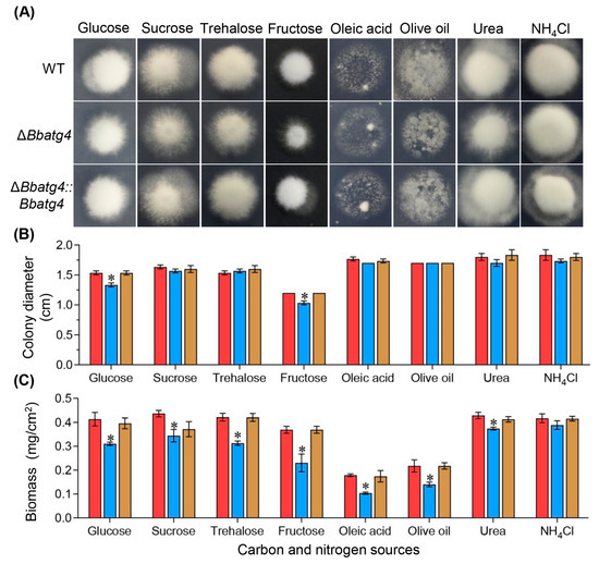 To determine the roles of BbAtg4 in nutrient utilization, vegetative growth was evaluated on different carbon or nitrogen sources (Figure 2A). After a 7-day incubation at 25 °C, ΔBbatg4 showed no significant reduction in colony diameter. Only on the culture medium using glucose and fructose as carbon sources, the colony diameter of ΔBbatg4 decreased slightly, with a reduction of 13.04% and 13.88%, respectively, when compared with that of the wild-type strain. However, the colony biomass of ΔBbatg4 mutant was significantly less than that for the wild-type and complementation mutant strains (Figure 2B). On various nutrients, the mycelial biomass of ΔBbatg4 decreased by 6.79 to 42.04%. These data indicated that BbAtg4 contributes to fungal vegetative growth (Figure 2C).