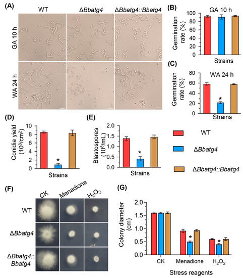 As shown in Figure 3F,G, without stress, after a 7-day incubation at 25 °C, ΔBbatg4 mutant showed no significant growth defects. On plates supplemented with menadione, the colony diameter for the wild-type and ΔBbatg4 mutant strains were 0.92 ± 0.08 and 0.50 ± 0.04 cm, respectively. Under H2O2 stress, the colony diameter for the wild-type and ΔBbatg4 mutant strains were 0.60 ± 0.04 and 0.40 ± 0.04 cm, respectively. These results indicated ΔBbatg4 displayed an enhanced sensitivity to oxidative stress.