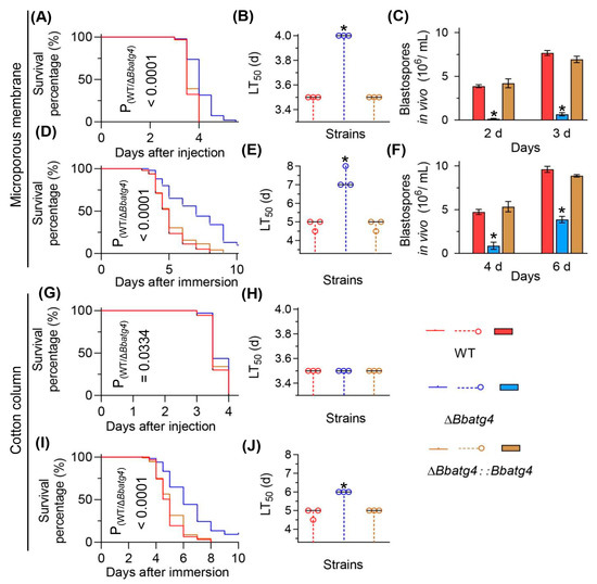 Then, we used the conidial suspension prepared with method 1 in bioassay. As shown in Figure 4G–J, in the intrahemocoel injection bioassay, the LT50 value of ΔBbatg4 was 3.5 d and identical to that of the wild-type strain (3.5 d). In topical infection bioassay, the LT50 of ΔBbatg4 was only delayed by 1.27 d when compared to that of the wild-type strain. These results indicated that conidial suspension prepared with different methods displays different effects on the outcome of bioassay.