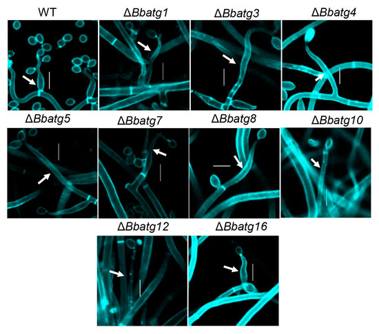 Previous studies have shown that the ‘core’ autophagic genes (BbAtg1, BbAtg3, BbAtg5, BbAtg7, BbAtg8, BbAtg12 and BbAtg16) are essential for spore formation in B. bassiana [4,9,24,25,26]. In this study, we examined the spore-producing structures in mutant deficient of the above ATGs. As shown in Figure 5, on the aerial surface, disruption of any one of the above ATGs resulted in significant impairment in fungal conidiophores. Microscopic examination indicated that the wild type produced abundant numbers of ‘bottle’ shaped conidiophores at 4 days post-incubation (dpi). However, at 7dpi, the autophagy-null strains produced the elongated and emaciated conidiophores, and very few conidia were observed.