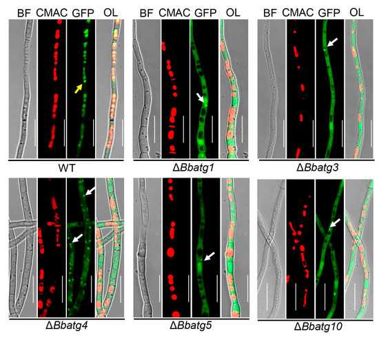 The autophagic process in aerial mycelia of B. bassiana. Fusion gene GFP-ATG8 was transformed into the wild type (WT) and its autophagy-null strains. Conidial suspension of the indicated transformant was inoculated on SDAY plate and cultured for 3.5 d at 25 °C. The resultant mycelia were stained with CMAC (for vacuole), and autophagic process was examined under a fluorescent microscope. Autophagic signals were observed in the vacuoles of WT (yellow arrow), and Atg8 aggregates were only seen in cytosol of autophagy-null strains. BF: bright field; OL: overlapped. Scale bars: 10 μm.