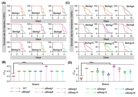 In the intrahemocoel injection bioassay (Figure 7A), all disruptants killed all bioassay insects, and all survival trends caused by autophagy-null mutants showed significant differences from that of the wild-type strain. In addition, there was a significant difference in the survival curve (Table 1) between the wild-type and individual mutant strains. As shown in Figure 7B, the median lethal time (LT50) value of the wild type was 3.5 d. The LT50 values of ΔBbatg1, ΔBbatg3, ΔBbatg4, ΔBbatg5, ΔBbatg7, ΔBbatg10, ΔBbatg12 and ΔBbatg16 were delayed to 4 d, while LT50 of ΔBbAtg8 was delayed to 4.5 d. In topical application bioassay (Figure 7C), the wild type killed all tested hosts and exhibited a host survival curve that was significantly different from those caused by gene disruption mutants. As shown in Figure 7D, LT50 for the wild-type strain was 4.83 ± 0.24 d. Whereas, the LT50 values of ΔBbatg1, ΔBbatg3, ΔBbatg4, ΔBbatg5, ΔBbatg7, ΔBbatg8, ΔBbatg10, ΔBbatg12 and ΔBbatg16 were 8.00, 7.00, 7.33, 6.67, 6.17, 8.87, 7.67, 6.83 and 7.00 d, respectively.