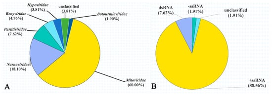 Except for four unclassified mycoviruses (3.81%), the remaining 101 putative viral genomes showed affinity with six distinct families, namely Mitoviridae (63 putative viruses, 60.00%), Narnaviridae (19 putative viruses, 18.10%), Partitiviridae (eight putative viruses, 7.62%), Benyviridae (five putative viruses, 4.76), Hypoviridae (four putative viruses, 3.81%), and Botourmiaviridae (two putative viruses, 1.90%) (Figure 2A). Moreover, the genomes of 105 putative mycoviruses contained three nucleic acid types, including +ssRNA (Mitoviridae, Narnaviridae, Benyviridae, Hypoviridae, Botourmiaviridae, and two unclassified mycoviruses), dsRNA (Partitiviridae), and –ssRNA (two unclassified mycoviruses), with +ssRNA (accounting for 88.57% of the total viruses) being the most predominant (Figure 2B).