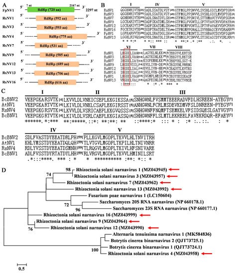 The results of phylogenetic tree constructed based on the aa sequence of RdRps of eight putative narnaviruses identified in this study and six reference viruses belonging to the family Narnaviridae retrieved from NCBI database showed that the eight putative narnaviruses were divided into two clades (Figure 4D). RsNV 1, 3, 7, 9, 12, 13, and 16 were clustered together with FpNV1, Saccharomyces 20S RNA narnavirus (ScNV-20S, GenBank accession number NP660178.1), and Saccharomyces 23S RNA narnavirus (ScNV-23S, GenBank accession number NP660177.1) (Figure 4D), while RsNV4 was clustered together with AtNV1, Botrytis cinerea binarnavirus 1 (BcBNV1, GenBank accession number QJT73724.1), and Botrytis cinerea binarnavirus 2 (BcBNV2, GenBank accession number QJT73725.1), the latter two of which was suggested to the members of a new proposed family Binarnaviridae [] (Figure 4D).