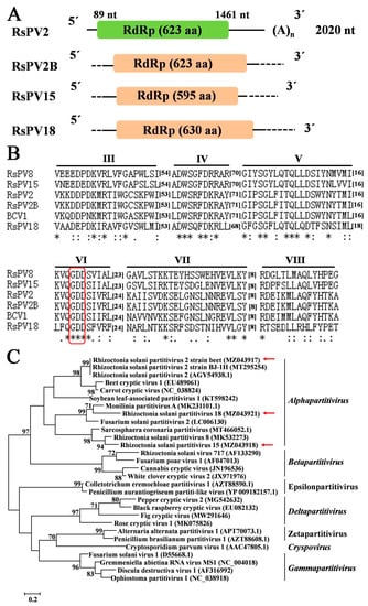 Among the nine contigs, three contigs (Contig 3073, Contig 3529, and Contig 14630) composing the three putative mycoviruses, RsPV15, RsPV2B, and RsPV18, respectively, were predicted to have a complete ORF encoding RdRp, with the length of aa sequence ranging from 595 aa to 630 aa, which were chosen to perform genome organization (Figure 5A), multiple alignment (Figure 5B), and phylogenetic analysis (Figure 5C). Contig ID, size, mycovirus name, best match, identity, query cover, E-value, and accession number were listed in Table 5. Multiple alignment of the three partitiviruses (RsPV15, RsPV2B, and RsPV18) and three reference viruses revealed that five conserved motifs (motif III to motif VII) containing the GDD tripeptide were found to be present in RdRp domain of these six viruses (Figure 5B). Results of the phylogenetic tree constructed based on the RdRp aa sequence of these three partitiviruses in this study and representative members from five genera (Alphapartitivirus, Betapartitivirus, Gammapartitivirus, Deltapartitivirus, and Cryspovirus) and two proposed genera (Epsilonpartitivirus and Zetapartitivirus) within the family Partitiviridae indicated that the three mycoviruses (RsPV15, RsPV2B, and RsPV18) belonged to the genus Alphapartitivirus (Figure 5C); moreover, RsPV2B was clustered together with RsPV2 and Rhizoctonia solani partitivirus strain BJ-1H (RsPV2-BJ) [] (Figure 5C).