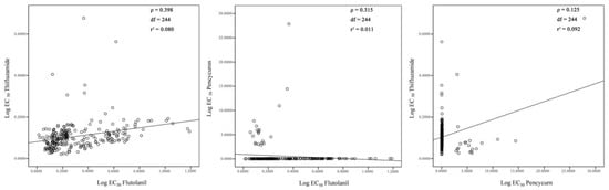 Cross-resistance of Rhizoctonia isolates to flutolanil, thifluzamide, and pencycuron was determined by a Spearman’s rank correlation analysis. Presented data represent the logarithmic values of the median effective concentrations (Log EC50) of the tested fungicides on mycelial growth of Rhizoctonia isolates.