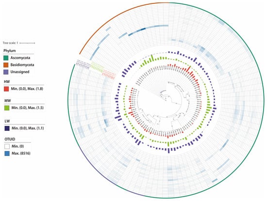 The phylogenetic tree shows the basic situation of fungal communities under a natural moisture gradient on the south shore grassland ecosystem of Hulun Lake. HW: high water content; MW: medium water content; LW: low water content. The ring colors represent fungal clades; the bars represent the relative abundance of ASVs; the heat map represents the correlation between ASVs, and the tree represents the results of hierarchical clustering.