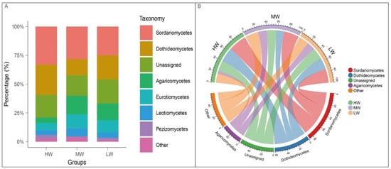 The relative abundances under a natural moisture gradient on the south shore grassland ecosystem of Hulun Lake are represented by stacked column diagram (A) and chord diagram (B), respectively. HW: high water content; MW: medium water content; LW: low water content.