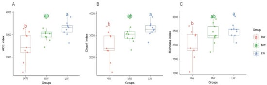 Diversity of ACE (A), chao1 (B), and richness index (C) of soil fungal communities under a natural moisture gradient on the south shore grassland ecosystem of Hulun Lake. HW: high water content; MW: medium water content; LW: low water content. Boxplots with different letters above the box indicate significantly different means (p < 0.05).