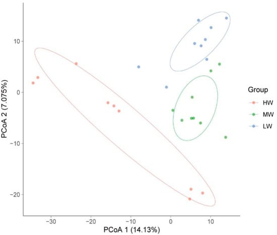 Based on Euclidean distance, PcoA showed that the fungal communities were clearly separated under a natural moisture gradient, and the first and second axes explained 14.13% and 7.08%, respectively (Figure 4). HW, MW, and LW contained the shared ASV sequences of 61 soil fungi between and among them. The number of shared ASVs between LW and MW was higher, at 26. The next highest number of ASVs was shared between HW and LW, which was 13. Further, the number of ASVs shared between HW and MW was 5. The number of unique ASVs were 116, 90, and 86 under HW, MW, and LW, respectively, and then a total of 292 ASVs were affected by SWC in the soil (Figure 5).