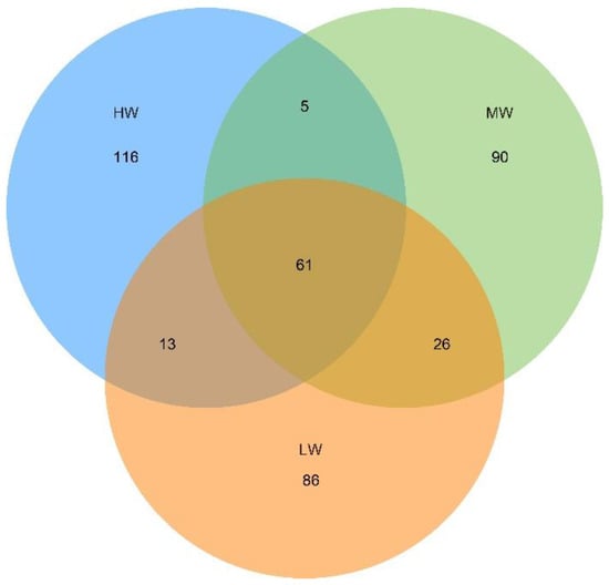 The unique ASVs and shared ASVs among the three groups are shown under a natural moisture gradient in the grassland ecosystem on the south shore of Hulun Lake, according to Venn diagrams. HW: high water content; MW: medium water content; LW: low water content.