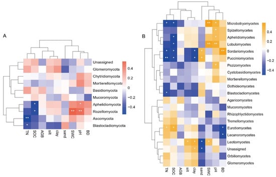 The relationship between the abundance of fungi phylum (A) or fungi class (B) and environmental factors. The relationship between environmental factors and the relative abundance of fungi was illustrated by Spearman’s correlation (* p < 0. 05; ** p < 0.01).