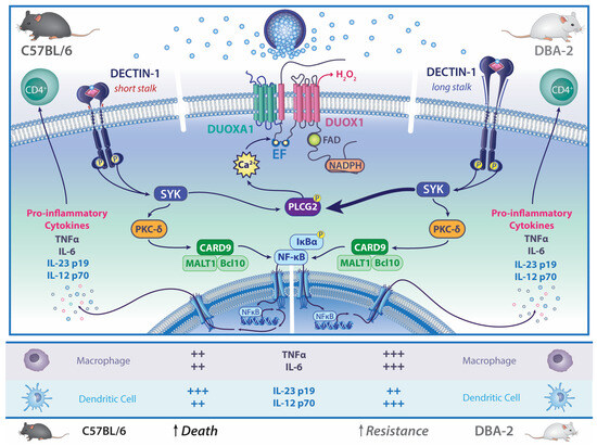 Differential responses to coccidioidal infection in mice. C57BL/6 mice are highly sensitive to coccidioidal infection and possess Dectin-1, which encodes a short stalk. DBA-2 mice are resistant to coccidioidal infection and possess Dectin-1 which encodes a long stalk. Expression of pro-inflammatory cytokines from immune cells stimulated by Coccidioides spp. differs between the two inbred strains of mice. The cytokine differences listed have been observed experimentally and are not the exclusive source of the cells listed. Illustration by Nicole Wolf, MS, ©2023.
