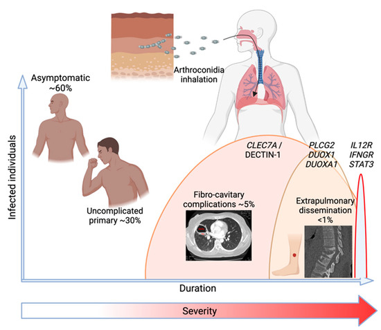 The range of clinical manifestations of human coccidioidomycosis and their overall frequency of occurance in relation to common durations of illness and severity and the several genetic variants associated with each. Created in BioRender.