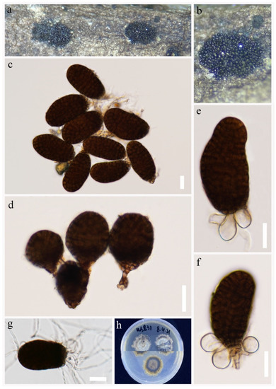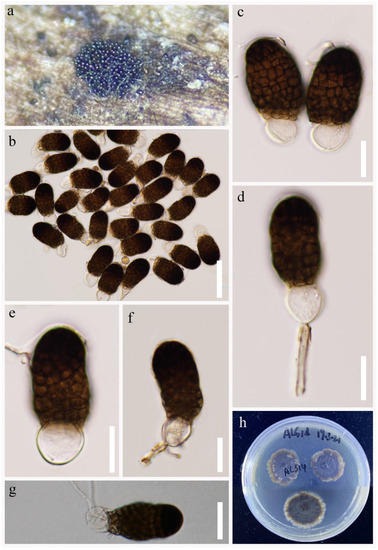 Pleopunctum pseudoellipsoideum (HKAS 124274). (a) Colonies on natural substrates. (b,c,e) Conidia. (d,f) Conidiophores and conidia with basal hyaline cells. (g) Germinated conidium. (h) Colonies on PDA. Scale bars: (b) = 50 μm, (c–g) = 20 μm.