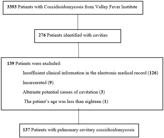 Flowchart of patients with inclusion and exclusion criteria in the study of pulmonary cavitary coccidioidomycosis.