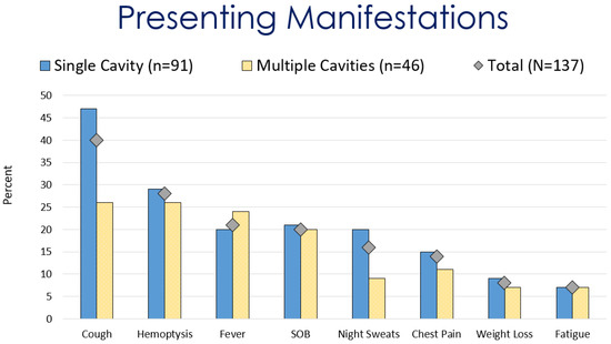 Of the initially 276 identified patients, 137 met the inclusion criteria. At diagnosis, the most common presenting symptoms of pulmonary coccidioidal cavitary disease were cough (55%), hemoptysis (38%), fever (29%), and shortness of breath (28%) (Figure 2. Other symptoms included chest pain (19%), weight loss, and decreased appetite (11%). Twenty-one cases (15.3%) were immunocompromised/transplant patients. Twenty-six (19%) cases of cavitary lung disease were coexistent with disseminated coccidioidomycosis (Table 1).