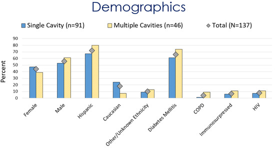 Recent research on cavitary coccidioidomycosis has focused on cavitary management in a largely Caucasian demographic and has shown an association with diabetes mellitus type 2 (DM) [15,16]. Recent data published by Crum et al. reviewed 223 patients from 1994–2002, of which 29 (13%) of coccidioidomycosis cases had coccidioidal pulmonary cavities, with only one requiring surgery for empyema [18]. In 2006, Santelli et al. concluded that patients with DM were more likely to have cavitary lung disease after reviewing 329 patients with coccidioidomycosis [15]. Later, Panicker et al. focused on the influence of triazole therapy on cavitary closure in 271 cavitary patients from a single site in Arizona [16].