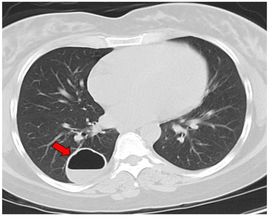 CT image of a single coccidioidal pulmonary cavity. The red arrow indicates a cavity.