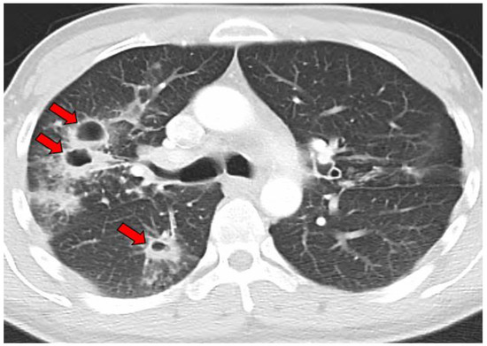 CT image of multiple coccidioidal pulmonary cavities. The red arrows indicate cavities.