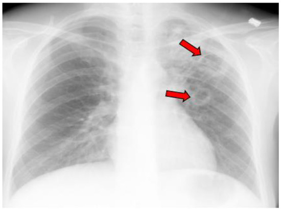 X-ray image of multiple coccidioidal pulmonary cavities. The red arrows indicate cavities.