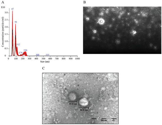 Extracellular vesicles (EVs) produced by Candida haemulonii var. vulnera. (A) Nanoparticle-tracking analysis of EVs isolated from C. haemulonii culture supernatant was performed using NanoSight NS300. Representative graph depicting the particle-size distribution and concentration of EV profiles from C. haemulonii (EVs × 1011 particles/mL). (B) Screenshot from the video recorded using NanoSight NS300, presenting EV distribution. (C) Image produced using transmission electron microscopy (TEM). The EVs from C. haemulonii showed a globose morphology and the diameter of these EVs was in the range of the diameters of EVs obtained using Nanoparticle Tracking Analysis (NTA).