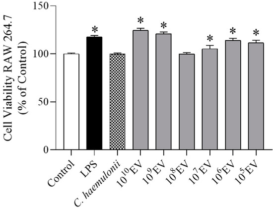 Viability of RAW 264.7 cells stimulated with increasing concentrations of extracellular vesicles (EVs) from Candida haemulonii var. vulnera. RAW 264.7 cells were incubated for 24 h with increasing concentrations of EVs from C. haemulonii var. vulnera. The viability of RAW 264.7 cells incubated without EVs, lipopolysaccharide (LPS), or C. haemulonii was defined as 100% (Control). Data are expressed as the mean ± SEM of three independent experiments performed in triplicate, * p < 0.05 vs. control (one-way ANOVA, followed by Bonferroni test).