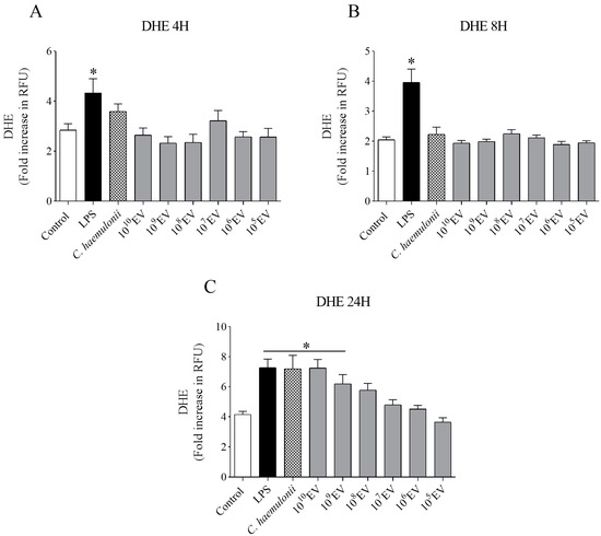 Measurement of reactive oxygen species (ROS) production in RAW 264.7 cells stimulated with Candida haemulonii and increasing concentrations of their extracellular vesicles (EVs). Superoxide anion concentration after 4 h (A), 8 h (B), and 24 h (C) of incubation was determined by measuring the fluorescence of the dihydroethidium (DHE) probe (λEx 540 nm, λEm 590 nm). LPS: lipopolysaccharide. Data are expressed as the mean ± SEM of three independent experiments performed in triplicate, * p < 0.05 vs. control (one-way ANOVA, followed by Bonferroni).