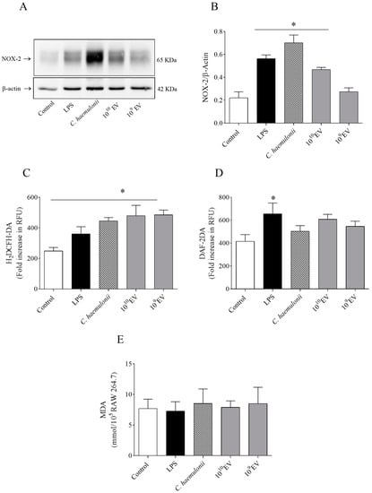 Candida haemulonii var. vulnera extracellular vesicles (EVs) induce an increase in reactive oxygen species (ROS) levels. (A) Representative immunoblot for NOX-2 (gp91-phox). (B) Representative bar graph for NOX-2. Immunoblot results are shown as the mean ± SEM of n = 6. (C) After a 24 h incubation, C. haemulonii and its EVs (1010–109 particles/mL) increased H2O2 levels in RAW 264.7 cells. ROS production was determined by measuring the fluorescence of the 2′,7′-dichlorodihydrofluorescein diacetate (H2DCFH-DA) probe (λEx 485 nm, λEm 528 nm). (D) Nitric oxide levels were measured using the fluorescent probe 4-amino-5-methylamino-2′,7′-difluorofluorescein diacetate (DAF) (λEx 495 nm, λEm 515 nm). (E) Malondialdehyde (MDA) concentration in RAW 264.7 cells after 24 h exposure to all stimuli. We demonstrate that oxidative bursts generated from these groups were not harmful to macrophages. LPS: lipopolysaccharide. Data are expressed as the mean ± SEM of three independent experiments performed in triplicate, * p < 0.05 vs. control (one-way ANOVA, followed by Bonferroni test).