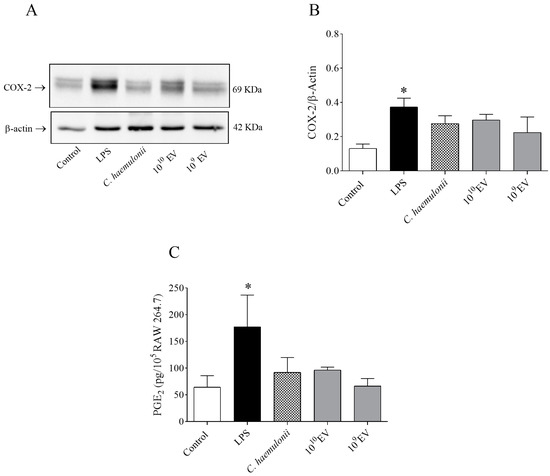 Candida haemulonii var. vulnera extracellular vesicles (EVs) did not induce an increase in the expression levels of PGE2 and COX-2. (A) Representative immunoblot for COX-2. (B) Representative bar graph for COX-2. (C) PGE2 levels determined using ELISA. LPS: lipopolysaccharide. Results are shown as the mean ± SEM of n = 6. One-way ANOVA followed by Bonferroni’s multiple comparison test were used to compare groups (* p < 0.05).