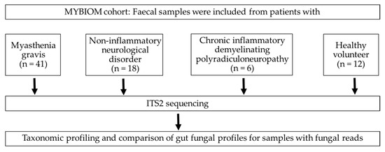 Myasthenia gravis (MG) is an autoimmune-mediated disorder with autoantibodies targeting different proteins of the neuromuscular junction [1]. Classification of different autoantibody types, particularly antibodies against the acetylcholine receptor (AChR), helped to clarify the mechanisms of symptoms such as exercise-induced muscle weakness. However, the pathogenic trigger of MG is yet not fully understood. Altered gut microbiota is a possible predisposing factor for MG [2,3]. Bacterial gut microbiota profiles of MG patients differ from those of healthy volunteers [3,4,5]. In the last few years, several cohort studies, as well as rat models, have implicated the bacterial gut microbiota in MG induction and severity [3,4,5,6]. However, sufficient data on fungal gut microbiota profiles of MG patients compared with those of patients with other inflammatory or non-inflammatory neurological diseases is still lacking. Specific compositions of the gut mycobiome are associated with autoimmune conditions such as multiple sclerosis (MS) [7,8], and an increase in Candida spp. is linked to neurological disorders such as autism spectrum disorders [9], schizophrenia [10] and Rett syndrome [11]. Although it is not fully understood how C. albicans contributes to the pathogenesis of these diseases, one well-established mechanism for the increase in C. albicans abundance seen in disease is that colonisation of C. albicans can drive T-helper-17 cell-mediated immune responses, leading to exacerbation [12]. Through the activation of pattern recognition receptors, mannans, fungal cell wall constituents from C. spp., induced Th17 and IL-23 responses, leading to the worsening of intestinal graft-versus-host disease and colitis in mice [13,14,15]. We present here a sub-analysis of the previous MYBIOM study, a single-centre observational study on bacterial gut microbiota with 77 participants, to determine whether the fungal gut microbiota is altered in MG patients compared with non-inflammatory neurological disorder (NIND), patients with chronic inflammatory demyelinating polyradiculoneuropathy (CIDP) and healthy volunteers (HV) without neurological disorders [3].