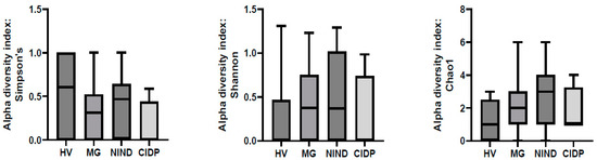 Comparison of alpha-diversity indices of the different study groups MG, NIND and CIDP using the Kruskal–Wallis test. Data are presented as mean ± standard error of the mean. HV, healthy volunteer; MG, myasthenia gravis; NIND, non-inflammatory neurological disorder; CIDP, chronic inflammatory demyelinating polyradiculoneuropathy.