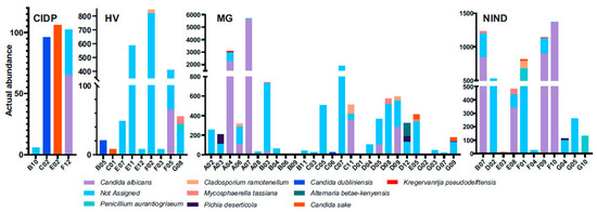 The composition of fungal microbiota from faeces was characterized by the presence of yeasts and moulds. Subjects with failed assignment to fungal species belonged to all groups (CIDP 2/4, HV 7/9, MG 22/27 and NIND 8/11).