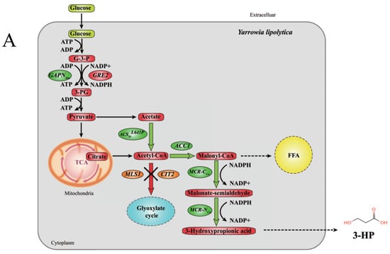 (A) Schematic representation of the conversion of glucose to 3-HP through the malonyl-CoA pathway in Yarrowia lipolytica. GRE2: endogenous NADPH-dependent methylglyoxal reductase coding gene; GAPN: non-phosphorylating glyceraldehyde-3-phosphate dehydrogenase coding genefrom Streptococcus mutans; ACS: modified acetyl-CoA synthetase (mutated Leu-641 to Pro) coding gene from Salmonella enterica; ACC1: acetyl-CoA carboxylase 1 coding gene; MCR-C: C-terminal domain of malonyl-CoA reductase coding gene from Chloroflexus aurantiacus; MCR-N: N-terminal domain of malonyl-CoA reductase coding gene from Chloroflexus aurantiacus. All expressed genes are marked by green ellipse. The knockout genes are marked by orange ellipse. MLS1: malate synthase 1 coding gene; CIT2: citrate synthase 2 coding gene; G-3-P: glyceraldehyde 3-phosphate; 3-PG: 3-phosphoglyceric acid; FFA: free fatty acids. (B) Malonate semialdehyde pathway in Yarrowia lipolytica. ACOX: acyl-CoA oxidase coding gene; ECH: enoyl-CoA hydratase coding gene; FOX2: multifunctional beta-oxidation protein coding gene; HIBCH: 3-hydroxyisobutyryl-CoA hydrolase coding gene; MMSDH: methylmalonate-semialdehyde dehydrogenase coding gene; HPDH: 3-hydroxypropionate dehydrogenase coding gene. The knockout genes are marked by red cross.