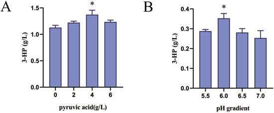 In addition to the modification of genes related to the malonyl-CoA pathway, changes in fermentation conditions can also increase 3-HP production. One option is the optimization of the fermentation medium. According to Figure 1, we attempted to add pyruvic acid, which was treated as an auxiliary carbon source for the medium under the premise of no glucose being added. Meanwhile, adding pyruvate acid can also push the metabolic flux towards acetic acid, increasing the production of 3-HP [41]. To explore the optimal concentration of pyruvate acid required to increase the yield of 3-HP, varying amounts of 0 to 6 g·L−1 pyruvate acid were added to the YPD medium, and their 3-HP production was prepared after culturing with a shake flask. As demonstrated by the results in Figure 5A, adding 4 g·L−1 pyruvate acid favored the 3-HP production best; the 3-HP yield of strain Po1f-NC-14 reached 1.373 g·L−1. Therefore, improving the yield of 3-HP can be attempted by adding pyruvate acid to the initial YPD medium, although this will increase the fermentation cost.