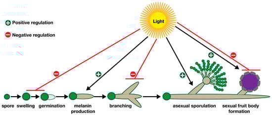 The switch from vegetative growth to asexual or sexual development is also highly responsive to light and controlled by illumination regimes (Figure 1). Although light inhibits initial germination of spores, light often promotes asexual spores (conidiogenesis) in most fungi such as Aspergillus, Neurospora, Trichoderma, and Fusarium, whereas production of sexual fruit bodies of some Mucorales and Basidiomycota members also requires light [13,29]. Some other fungi such as A. nidulans need darkness for fruit body formation (Figure 1) [11,30].
