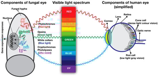 The fungal eye operates by using three different light receptors: blue light receptors (White Collars, vivid, cryptochromes, photolyases), green light receptors (fungal opsins) and red light receptors (phytochromes), which sense short, mid- and long wavelengths of light (Figure 2). In contrast to fungi which operate with three kinds of photoreceptors, the highly sophisticated vertebrate eye, including the human eye, uses only one kind of photoreceptor which is an opsin, green light receptor. Human eyes contain around 100 million specialized cells that can receive the light signal and convert it into neuronal impulses which are transmitted to the visual cortex of brain via optic nerves (Figure 2) [37]. There are two main types of photoreceptor cells on the surface of retina, rods and cones, respectively [38]. The rods are highly elongated cells which are sensitive to dim light and dark and contain rhodopsin as a light receptor. The rod cells make more than 90% of photoreceptor cells. They are not sensitive to colour, therefore they provide grey vision image in the brain. In contrast to the rods, the cone cells are shorter cells which contain cone opsins as light receptor and provide colour vision. Although all cone cells contain opsins, their spectral properties are different than rhodopsin and therefore they are sensitive to blue, green and red light wavelengths (Figure 2). These three types of red, green and blue cones constitute 4–5% of the total photoreceptor cell population. Combinations of these different signals (grey and colour photoreception) in the brain generate colour images by overlapping rod and cone signals. In addition to cones and rods, the retina also contains intrinsically photosensitive retinal ganglion cells (ipRGCs) which are involved in non-image forming vision that includes contrast sensing and entrainment of circadian clock [39].
