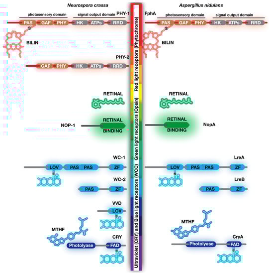 Common photoreceptor proteins and their chromophores (light-absorbing chemical groups) in two model filamentous fungi N. crassa and A. nidulans. Phytochromes, PHY-1 and PHY-2 in N. crassa and FphA in A. nidulans are light receptors that are attached to a linear tetrapyrrole (bilin) through a cysteine residue on PAS domain. The N-terminus of phytochromes acts as photosensor and contains three domains, PAS, GAF (cGMP-Adenylyl cyclase-FhlA) and PHY (distantly related to PAS) domains. The C-terminus of phytochromes contains signal transduction features with HK (histidine kinase), ATPase and RR (response regulator) domains which are similar to a hybrid form of bacterial two-component system. Red light causes conformational change on bilin and switches it from red-light-absorbing (Pr) to far-red-absorbing form (Pfr). Transmembrane fungal opsins are associated with retinal, an aldehyde form of vitamin A. Green light triggers conversion of 11-cis retinal to all-trans retinal. Blue light receptors are White Collar proteins (WC-1 and WC-2 in N. crassa, LreA and LreB in A. nidulans), vivid (VVD) and cryptochromes CRY (N. crassa) and CryA (A. nidulans). LOV (light oxygen voltage) domains found in WC and VVD or Flavin Binding (FBD) domain found in cryptochrome family are attached to FAD (flavin adenine dinucleotide) via a cysteine residue in these domains. Cryptochrome or photolyase family might have an additional accessory molecule, MTHF (methyl–tetrahydrofolate), which is not covalently attached to these proteins but found to be associated with them. In addition to the LOV domain, White Collar proteins also contain PAS (Per–ARNT–Sim) that mediates protein–protein interactions and a zinc finger DNA-binding domain which can bind to target sequences. The size of each protein is arbitrarily proportional to their amino acid sequence length (not shown).