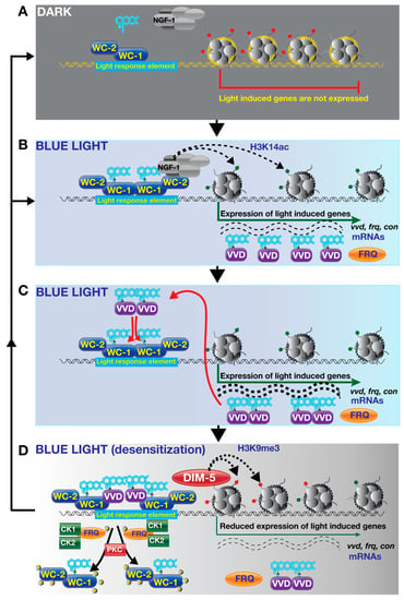 Like activation of light-dependent promoters, deactivation is also regulated by epigenetic markers. In N. crassa, silencing Histone 3 Lysine 9 trimethylation (H3K9me3) marks are catalyzed by the DIM-5 protein [111]. Photoadaptation is coordinated with histone methylation. frq gene is part of a circadian clock system and transcribed by WCC in response to light. Under normal conditions, frq mRNA, like all light-regulated mRNAs, peaks after illumination and decreases over time under constant illumination as part of the light-resetting system provided by the VVD-WC-1 interaction. However, deletion of DIM-5 (lack of H3K9me3 marks) results in more frq mRNA accumulation, even after prolonged illumination associated with more WCC binding in the frq promoter. It will be interesting to see how different histone modifications are distributed along the light-dependent genes during photoadaptation process. Are there other key modifications associated with active and inactive genes? Answering this question will further deepen understanding of light-dependent activation of genes.