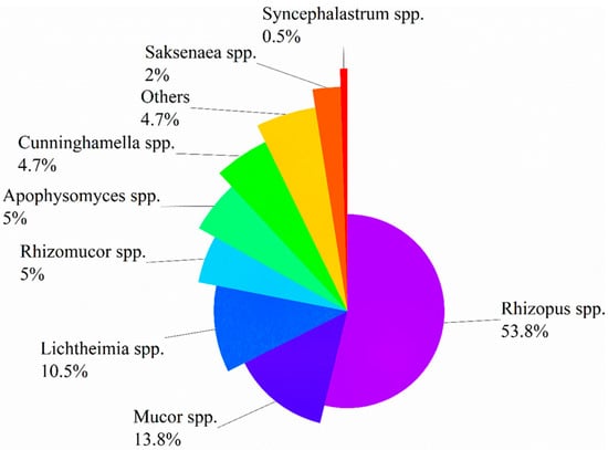 A study in Australia on 74 patients diagnosed with proven or probable IM, among whom 36 (48.6%) were complicated with HMs, and found that Rhizopus spp. (20/36, 55.6%) was the most common genus of Mucorales organisms, followed by Mucor spp. (6/36, 16.7%) and Rhizomucor spp. (4/36, 11.1%) []. Another meta-analysis reported 851 patients with proven or probable IM, of which 275 (33%) were complicated with HMs, and it documented that Rhizopus spp. was the major pathogen of IM, followed by Mucor spp. (14%) and Lichtheimia spp. (13%) []. Other pathogenic genera included Apophysomyces spp., Cunninghamella spp., Rhizomucor spp., Saksenaea spp., and Synchephalastrum spp., but they were relatively rare. Of note, the mortality associated with Cunninghamella infections was remarkably higher than that caused by other genera of Mucorales organisms (71% vs. 44%, p < 0.001). The author of this review summarized the clinical data of 1568 patients with IM (whose underlying diseases included HMs, diabetes mellitus, trauma, etc.) from nine studies (which included more than 50 cases) [,,,,,,,,], and found that the three major pathogenic genera were Rhizopus spp. (n = 778, 53.8%), Mucor spp. (n = 199, 13.8%), and Lichtheimia spp. (n = 152, 10.5%). Figure 1 illustrates the general distribution of common pathogenic genera of Mucorales organisms.