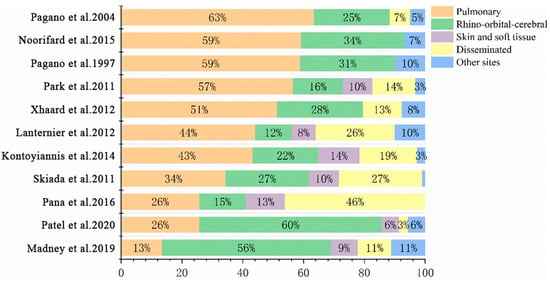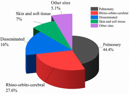 According to anatomic localizations and clinical manifestations, IM is divided into the following six clinical types: pulmonary mucormycosis (PM), rhino-orbital-cerebral mucormycosis (ROCM), disseminated mucormycosis, cutaneous/soft tissue mucormycosis, gastrointestinal mucormycosis and other rare forms, such as renal infection, endocarditis, osteomyelitis, peritonitis, and so on. CAM and IM in patients with diabetes mellitus usually manifest as ROCM. In contrast, most scholars believe that PM and disseminated mucormycosis occurs most often in patients with HMs. By analyzing cases of proven or probable IM in pediatric (≤19 years) patients, Pana et al. found that among 29 patients with PM, 22 had HMs, which were independently correlated with PM (odds ratio (OR) 4.4, p = 0.01) []. However, Slavin et al. analyzed 162 patients with NAIMIs (145 proven and 17 probable), of whom 74 (45.7%) were IM, and found HMs independently predicted disseminated infections (OR 2.7, p = 0.03) []. A study in Europe between 2005 and 2007 on 102 patients with HMs who were complicated with proven or probable IM indicated that the major sites of IM in these patients were pulmonary (n = 35, 34%) and disseminated (n = 28, 27%) []. On the other hand, in a retrospective study that included 20 patients with HMs who were diagnosed with proven IM, the most frequently involved site of IM was paranasal sinuses (n = 19, 95%) and PM only occurred in one patient (5%) []. We collected and analyzed infection sites of 604 cases of IM in HMs patients and HSCT patients from 11 studies [,,,,,,,,,,] which included more than 25 cases and had detailed records of involved sites of IM (some patients have two or more infection sites). The result showed that the most common form of IM in patients with HMs or patients undergoing HSCT is PM (44.4%), followed by ROCM (27.6%) and disseminated mucormycosis (16%), which is shown in Figure 2 and Figure 3.